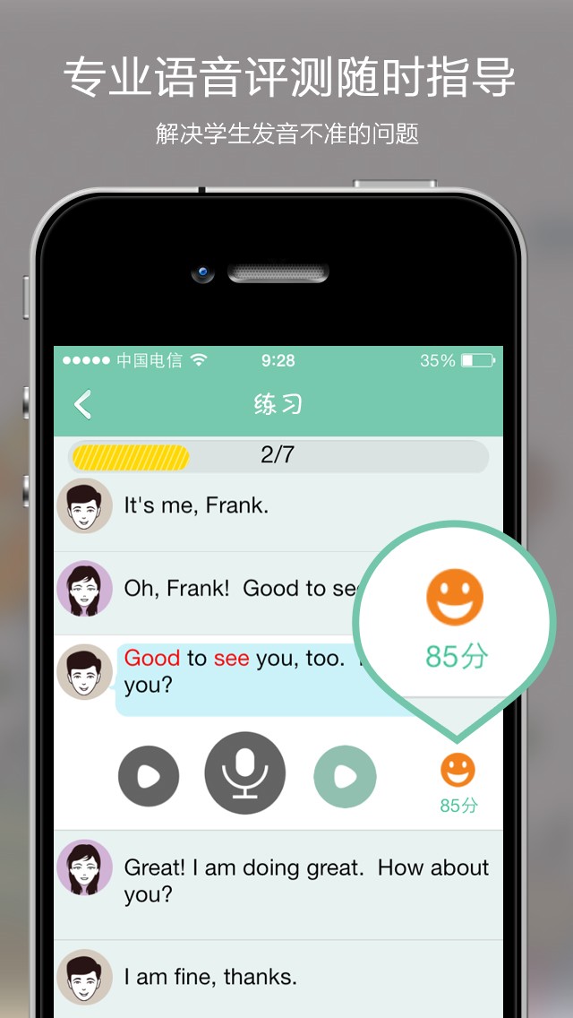 2、通过实时发音打分,帮你练就字正腔圆的地道口语;