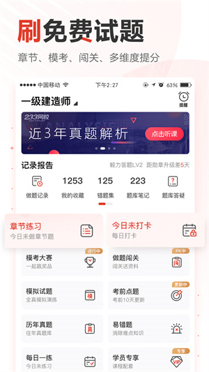 每日一练、章节练习、模拟考场、历年真题,海量试题应有尽有。不仅配备名师视频解析,让你随时随地掌上刷题,还设有做题记录、错题集、收藏试题、积分试题等功能,支持离线刷题。此外,还能进行个性化做题习惯设置,让移动学习变得更加便捷!