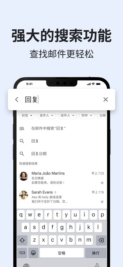 智能分类与搜索:邮件自动归类为“主要”“社交”“推广”等标签,支持关键词、发件人、日期等多维度搜索,提升查找效率。