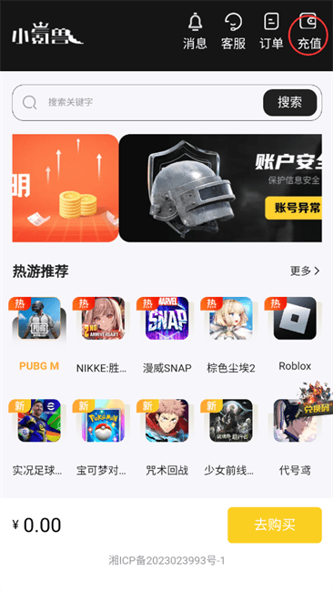 2、在首页顶端最右侧位置,找到“充值”按钮。既能够直接点击进行充值,也能够先选好游戏,之后再点击充值。