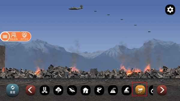 4、而中间多个功能按键则是破坏城市的各种方式,如下面类似雷达的图标,点击这个按钮,再点击城市,就会有一个陨石坠落到这座城市,将城市所有的建筑都摧毁掉。