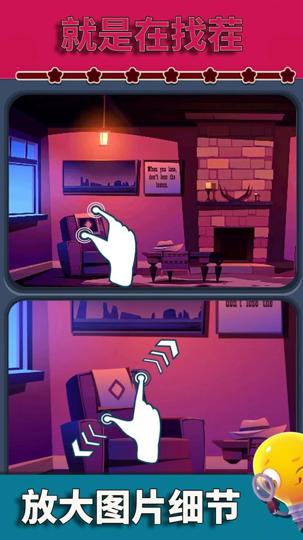 就是在找茬是一款轻松有趣的休闲游戏,玩家需要在限定时间内从两张看似相同的图片中找出不同之处,随着关卡的推进,难度逐渐增加,考验玩家的眼力和耐心,适合所有年龄段的玩家放松心情,挑战自我。