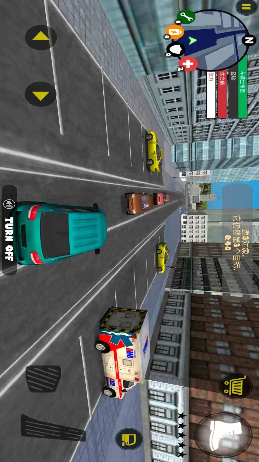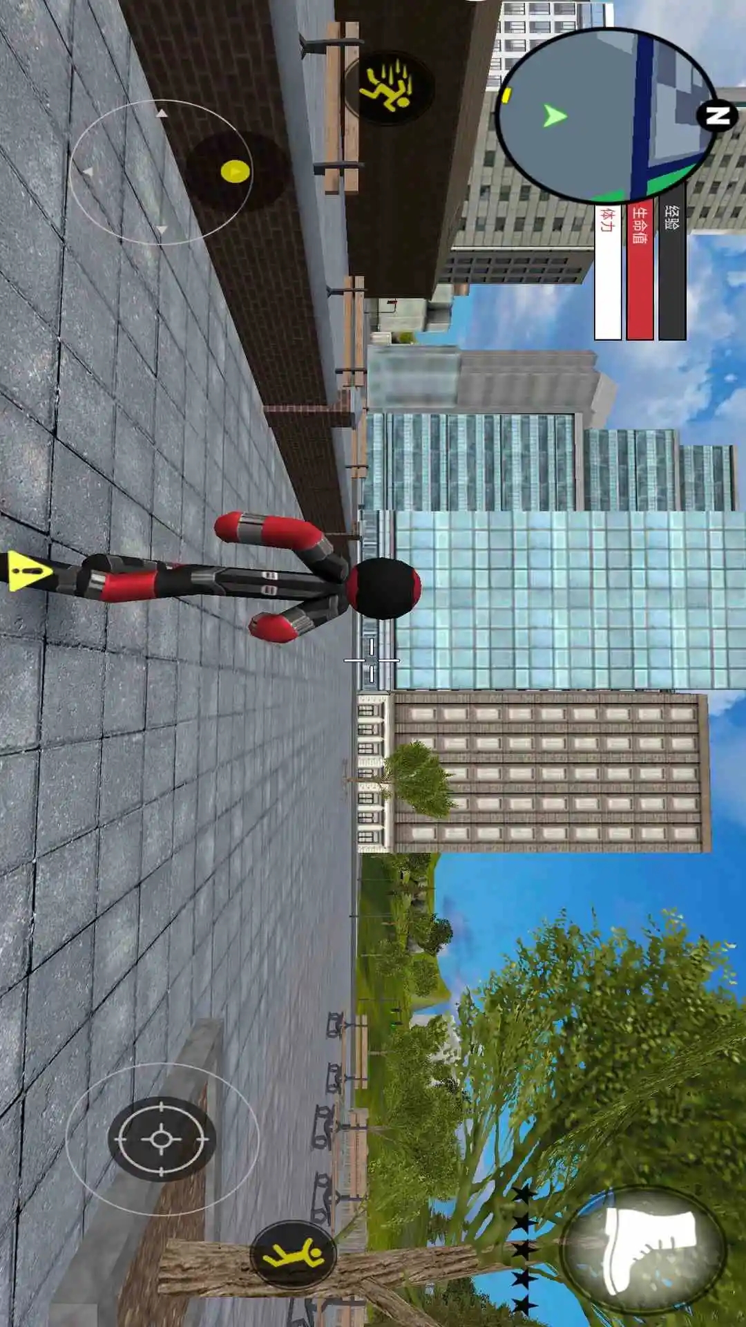 左侧移动、加速,右侧绳索,攻击(跳跃),跳跃,右上侧的武器更换以及血量、经验的显示都实时更新,一览无遗,凭借着大家自由的玩法,与其他帮派的人物进行交火,期间杀人能够获得经验,杀多了会产生星级,警察和其他附近角色会特殊照顾你对你展开火热的进攻,而如何存活,如何将其他人物击杀则是你所需要完成的任务。