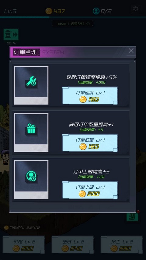 4、最后就是订单管理,在这里升级订单可以提高获取订单的速度、数量与上限。