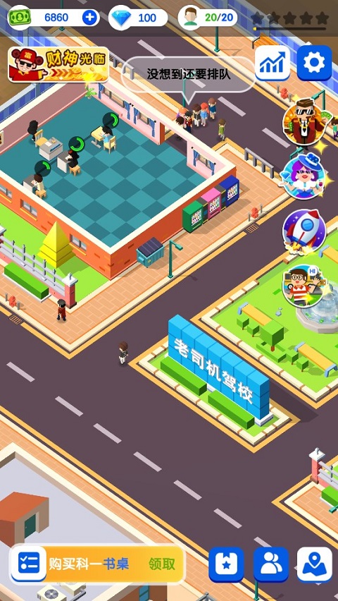 玩家通过拖拽操作进行场地规划,点击指派教练和车辆。需要实时监控学员进度条、车辆损耗值等数据,制定合理的培训计划,并通过广告投放、优惠活动等方式吸引生源。