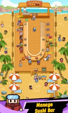 玩法主要分为两大模块:一是潜水模式,玩家在开放的海域中自由探索,使用工具捕捞鱼类,躲避潜在危险,发现海底秘密。二是经营模式,在餐厅内接受顾客点单,根据菜谱组合食材制作寿司,收取费用,管理库存和餐厅运营。两者通过资源需求和产出紧密相连。