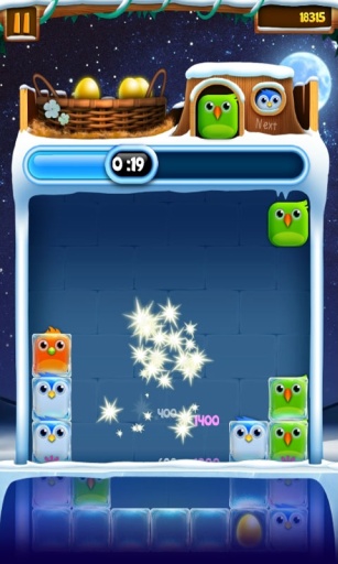 若一次聚集4只颜色相同的小鸟,就能获得一只发光鸟。当发光鸟被消除时,它周围紧邻的鸟或冰块会被一并消除。