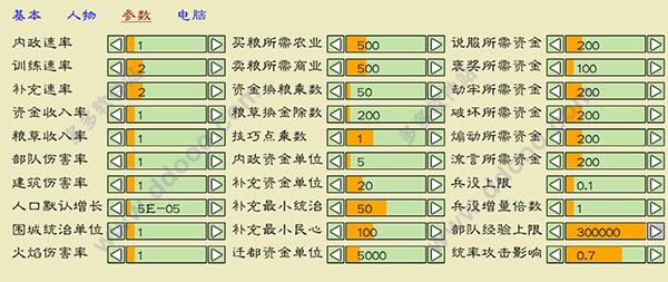 武将的五维,即武勇、统率、智谋、政治、魅力这几方面的经验,不会超出设定数值。每当五维经验各满1000时,就会分别增加1点对应的能力值。对于史实爱好者,若不喜欢过于强大(BT)的武将,推荐将相关数值调低。而喜欢这类强大(BT)武将的玩家,自然也能够将数值调高。