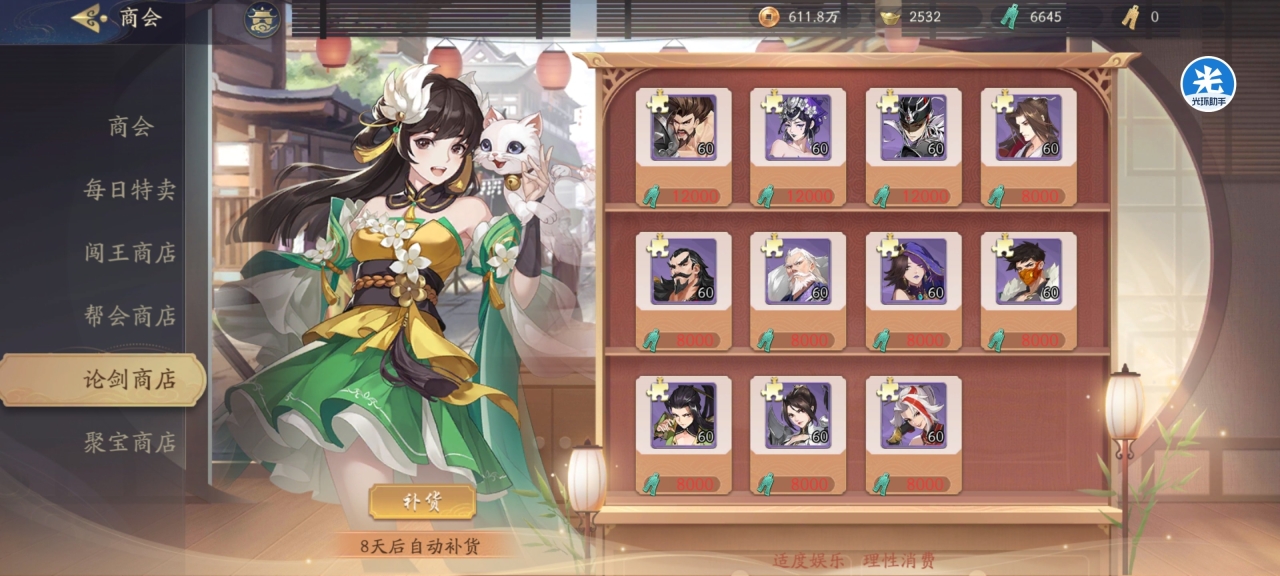 论剑推荐换六扇门李延广,中后期很厉害的c,打boss(玄武)这种特别好用,还有就是老头卡等级也建议换,毕竟六扇门前期不好成型。