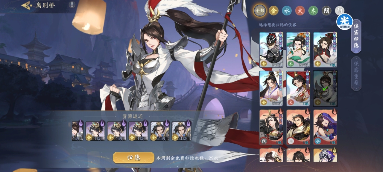 3.前期升星的时候可以把你不用的都喂了,先提升战力,等狗粮够再归隐出来,只要没升彩色都可以归隐,我就喂了很多暂时没用的大侠