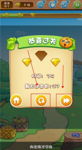 5、当所有蔬菜和水果都被消除后,就能赢得胜利,届时可选择重新挑战或者继续进入下一关。