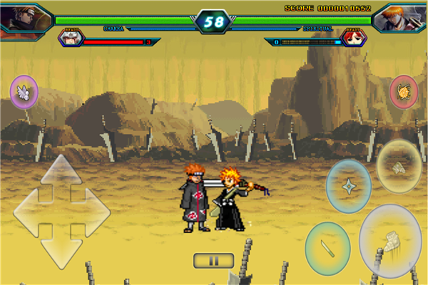 《死神vs火影竞技版》是一款融合《死神》与《火影忍者》两大动漫IP的格斗手游,以像素风格呈现经典角色与场景。游戏支持单人闯关、双人对战、在线匹配等模式,玩家可操控鸣人、一护等角色释放原著技能,通过连招、变身、援助系统等机制展开策略对决。游戏持续更新角色与玩法,兼具怀旧情怀与竞技深度。