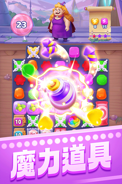 本作是一款以经典三消为核心,融入多样化闯关目标的任务驱动型休闲游戏。玩家在色彩缤纷的糖果或水果棋盘上,通过交换相邻图块的位置,形成直线或“L”、“T”型组合进行消除。每个关卡都有独特的设计与通关要求(如消除所有果冻、运送糖果到出口、击败糕点怪物等),需要玩家运用策略规划消除顺序,并巧妙使用各种强力道具来克服难关,享受闯关解谜的乐趣。