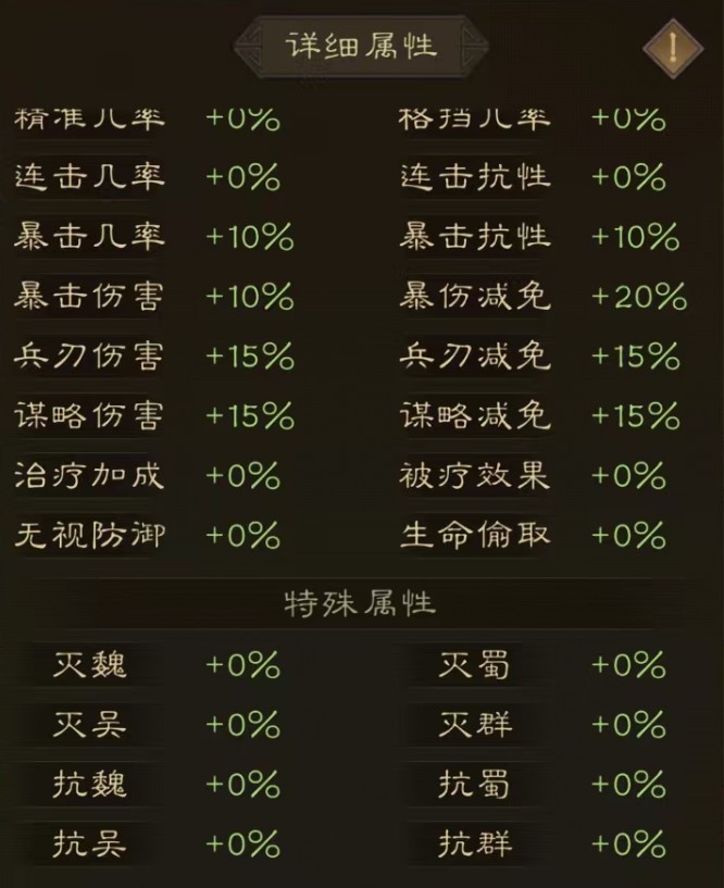 当然在属性设定上还有一些细节值得补充说明,就像上图呈现的那样,新三曹的属性配置其实是比较多元的——比如在增幅类属性里,除了大家熟悉的命中、闪避外,还包含精准(影响对方格挡概率的高低)、格挡(触发后能降低所受伤害)、连击,以及针对不同阵营武将的灭蜀/魏/吴/群(对对应势力武将有额外伤害加成),还有竞技场景专属的增减伤、竞技灭蜀/魏/吴/群等属性。正因为这些属性种类不少,我们也需要对其进行合理规划与搭配,才能让新三曹在实战中充分发挥出应有的效果。