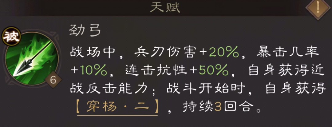 游戏里每位武将都有独特的天赋设定,这在同类游戏中算是比较常见的设计,而天赋与技能正是决定角色不可替代的核心因素。比如上面提到的新手可选的5星武将黄忠,他的天赋就很有特点:除了能增加兵刃伤害、提升暴击率和连击抗性外,最关键的是具备近战反击能力。要知道黄忠的职业是弓骑兵,原本没有1格近战输出的能力,有了这个天赋后,他在走位时就能更灵活从容。另外,战斗开始的前3回合,黄忠还能额外获得30%的兵刃增伤,加上天赋本身的加成,这3回合内他总共能有50%的兵刃增伤,这个增益效果可以说是相当强力了。