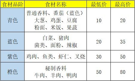 1、经我统计,当下测试服里总计有21种食材。我依据食材的背景颜色来划分品阶,可分为青色、蓝色、紫色以及橙色。在这些之中,橙色食材的出现概率比较低,要是大家看到橙色食材,且价格合适的话,就别犹豫,直接入手!