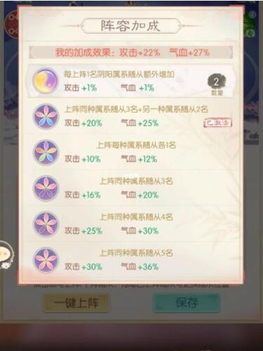 1、在《盛世芳华》里,推荐的阵容通常为3 + 2,如此能够获得加成。或许有些小伙伴会疑惑,同属性阵容难道不是更佳选择吗?其实不然,其一,全同属性阵容极易遭到克制;其二,最强的全阳或全阴属性阵容,卡牌获取与升星难度极大!就目前而言,绝大多数玩家手中的玄奘和花木兰,都无法对其星卡势力进行提升。