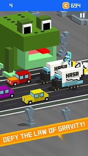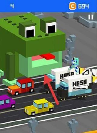 2、生存挑战:在第3、4、5关等关卡中,玩家需要在车流以及巨蛙、章鱼等特殊生物之间寻找路径,顺利通过当前关卡后即可进入下一个场景,同时会积累相应分数(界面上会显示“433”“694”之类的数值)。