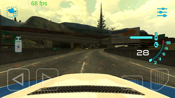 2、进入到游戏中有两种模式可以切换,当前模式是通过左右晃动手机来控制车的方向,右下角按键加速,左下角刹车