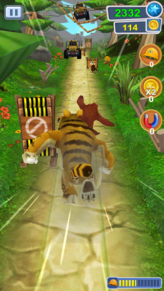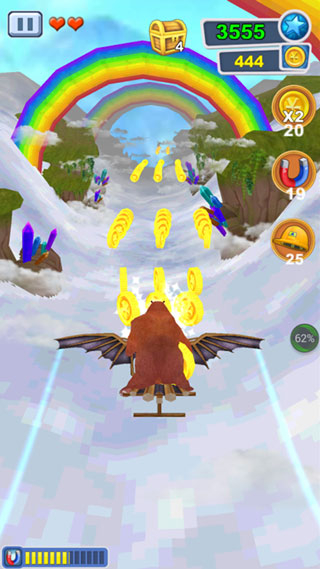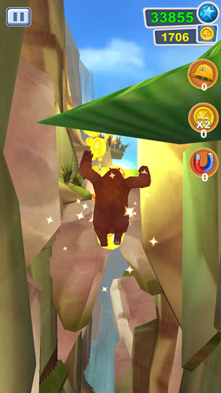 3、就像我们前面介绍说到的,你的目标是尽可能帮助熊大跑得更远,同时还尽可能的收集道路上的金币,游戏的视觉是面向角色前方前进的。