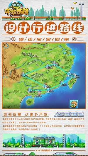 中华铁路,这是一款能让玩家尽情发展自身铁路事业的游戏。近年来,铁路事业蓬勃发展,铁路工作者们默默守护着我们的出行安全。在这款游戏里,你能深切体会到时代的进步,凭借自身智慧构建铁路帝国,为每一个归心似箭的朋友送去温暖,助力他们迅速踏上回家之路。