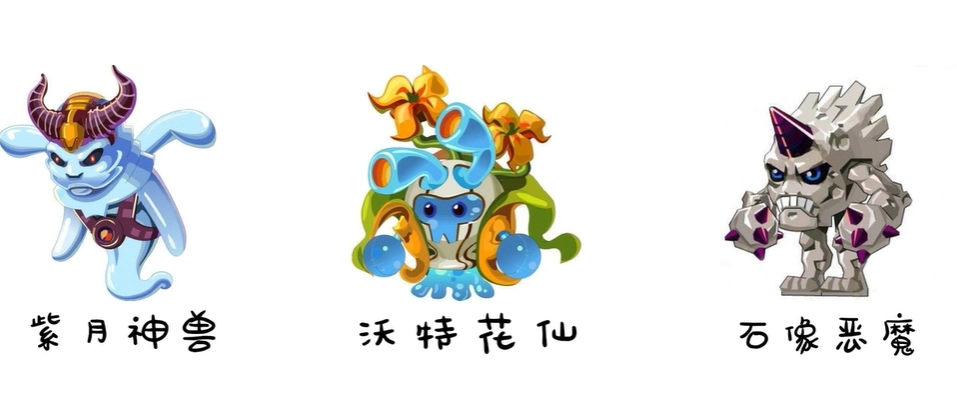 随着等级的提升,它们会依次进化成紫月神兽、沃特花仙与石像恶魔。