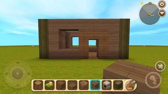 3、在高度为9格的那一面,使用不同的木料框出一个门的位置。接着,用木板将第4层的原木逐个连接起来,使其形成一个框架。此外,在非门位置且处于地面一层的地方,同样用木板连接起来,以此形成一个2格高的窗户位置。