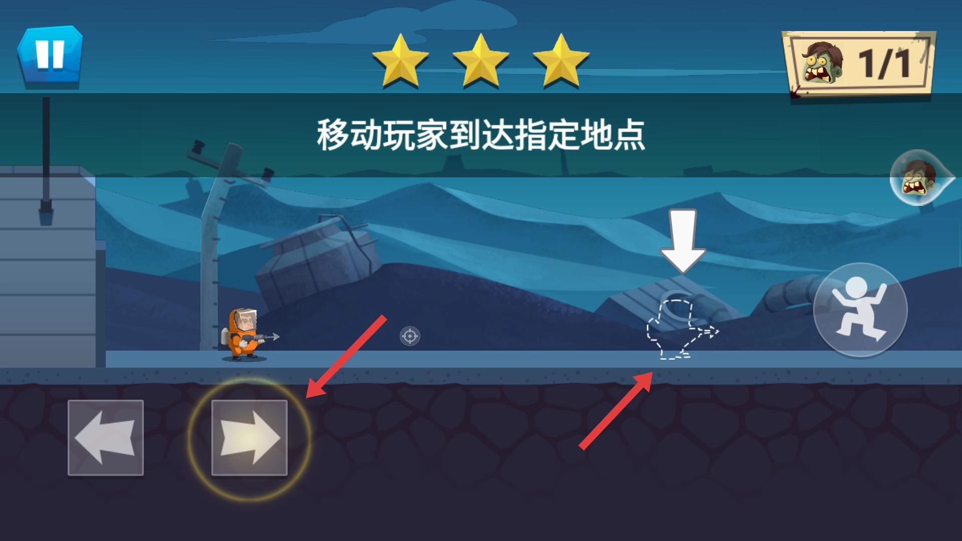 2、依据指引,用左右箭头移动角色,前往指定地点,注意避开障碍,到达后完成阶段任务,积累通关进度。