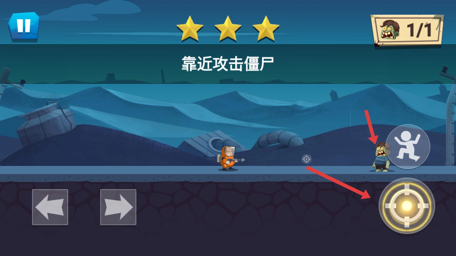 3、靠近僵尸时,点击攻击按钮,精准打击,利用移动灵活躲避,消灭僵尸获奖励,提升角色战斗能力。
