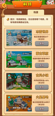 6、场景效果:海滨农场(作物全体收益加倍)、冰雪世界(每日30个)、蒙古草原(收割时额外获得5种子)、古风小镇(共同经营收益+50%)、火星基地(每日登陆即得300种子)