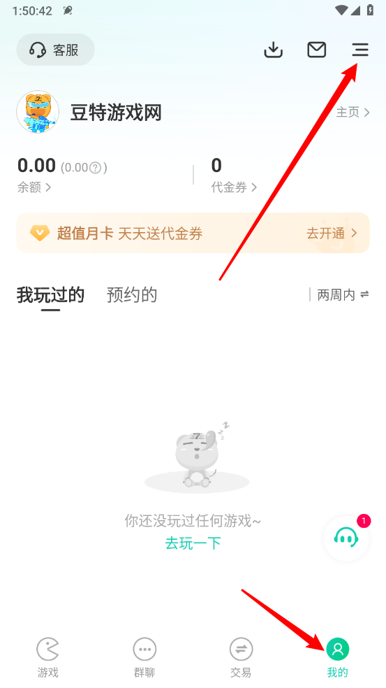 1、首先打开小7游戏,能看到下方设有游戏、群聊、回收、交易这些功能标识。