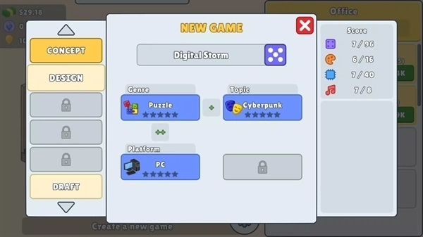 核心玩法:玩家需招募程序员、美术师等角色,组建团队研发游戏,选择类型(如RPG、卡牌)、平台(手机/主机)与主题,设定价格后发布。