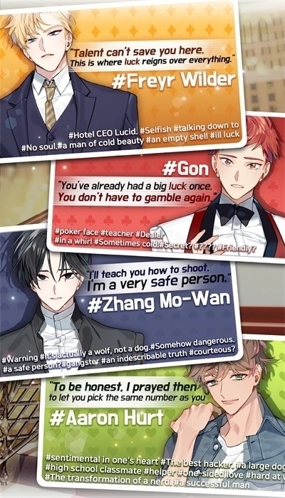 游戏以现代都市为背景,玩家扮演一名初入豪华露西德酒店的女性角色,在赌场经营与权力斗争中与四位男主产生交集。通过对话选择、送礼、约会等互动提升好感度,逐步解锁专属剧情与特殊结局。游戏融合恋爱养成与悬疑解谜元素,剧情分支丰富,结局多样。