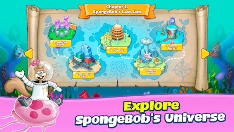 角色互动系统:蟹老板、珊迪等20余位经典角色悉数登场,每个角色拥有独立剧情线。例如,与珊迪合作可解锁“树屋实验室”场景,体验科学实验小游戏。