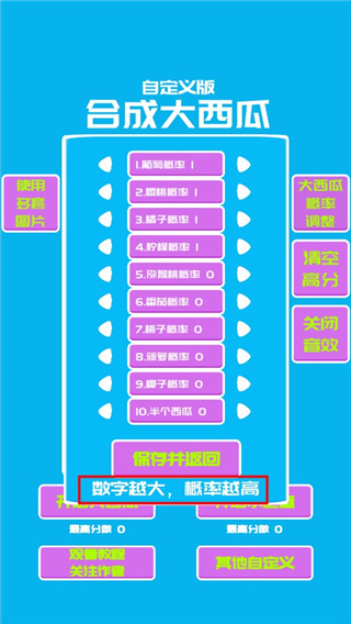 3、大西瓜出现概率调整功能上线,游戏内所有道具的出现概率均可进行设置,数值越高,对应道具出现的可能性就越大。