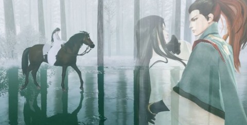 从竹筏上步入陆地后,骑马前往桥边。牵着女主的手下马,共同回忆往事。