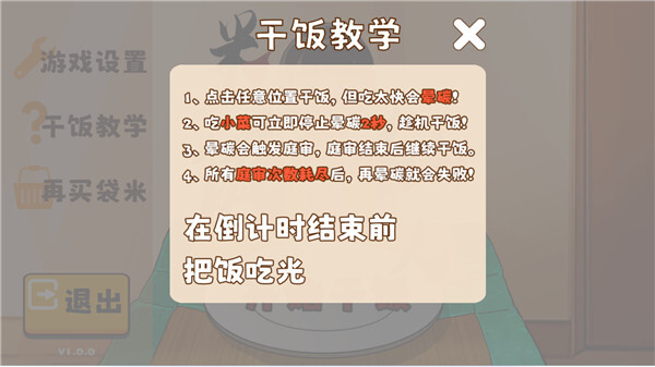 点击干饭:进入游戏后点击屏幕任意位置,让米饭仙人开始进食,每次点击会消耗一口米饭并增加晕碳值。