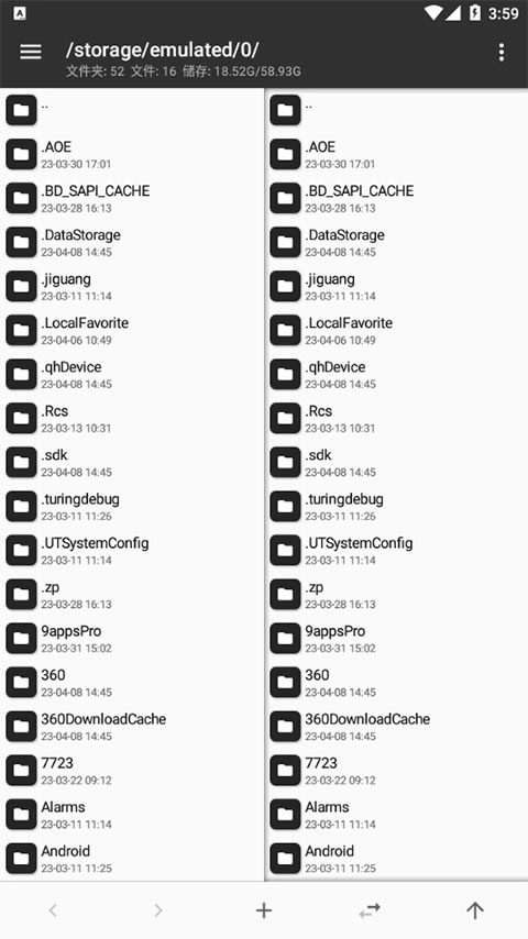 打开 MT 管理器后第一眼看到的就是它的左右两个操作窗口,该设计已经是 MT 的标志之一,与之对应的是双窗口操作模式。如果你是第一次使用,开始会不太适应,但相信我,等你花点时间来熟悉它后,你的操作效率会大大高于使用其它文件管理器。