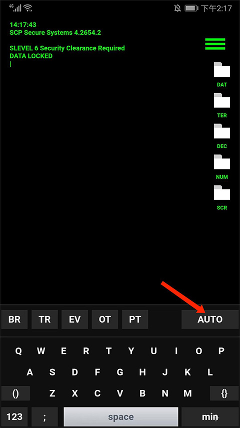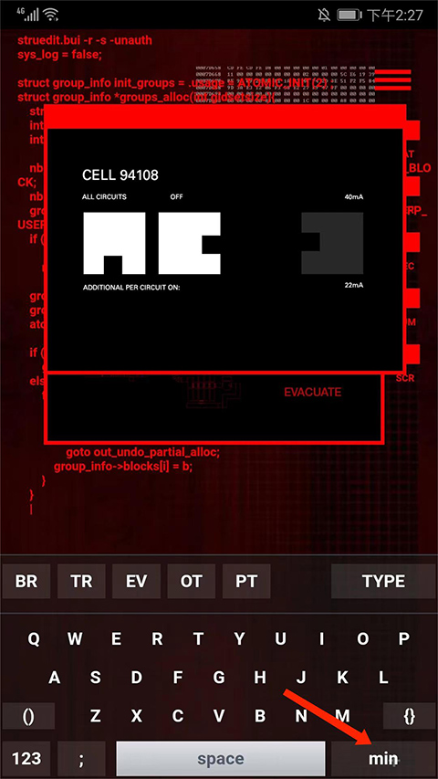 7、点击右下角的【min】选项,就能隐藏键盘,而点击【+号】图标则可恢复键盘。如此一来,是不是感觉更有专业黑客的范儿了呢?以上便是geektyper手机版的使用方法。