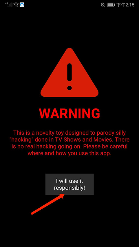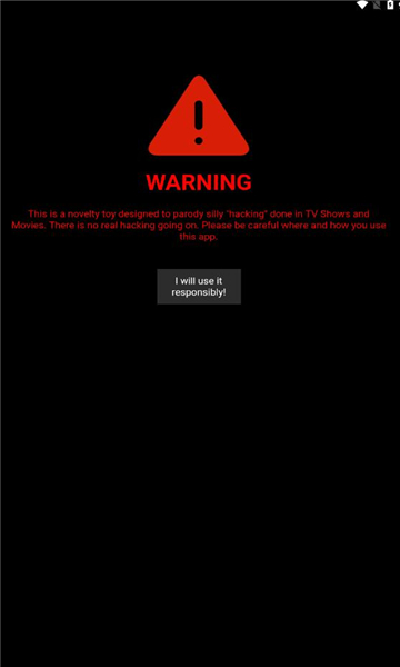 1、开启geektyper手机版本,进入应用的主界面,瞬间就能感受到一股黑客的氛围。接着点击下方【I will use responsiblly】的提示。