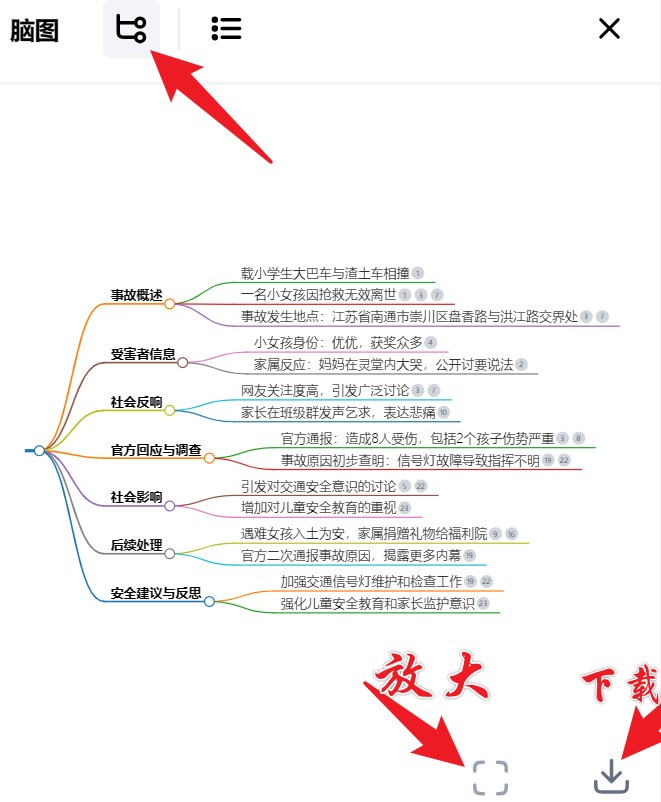 点击右下角的按钮可脑图,点放大按钮可以查看脑图的大图。看下图的脑图梳理事件,从各方面来呈现事件的发展,非常直观。