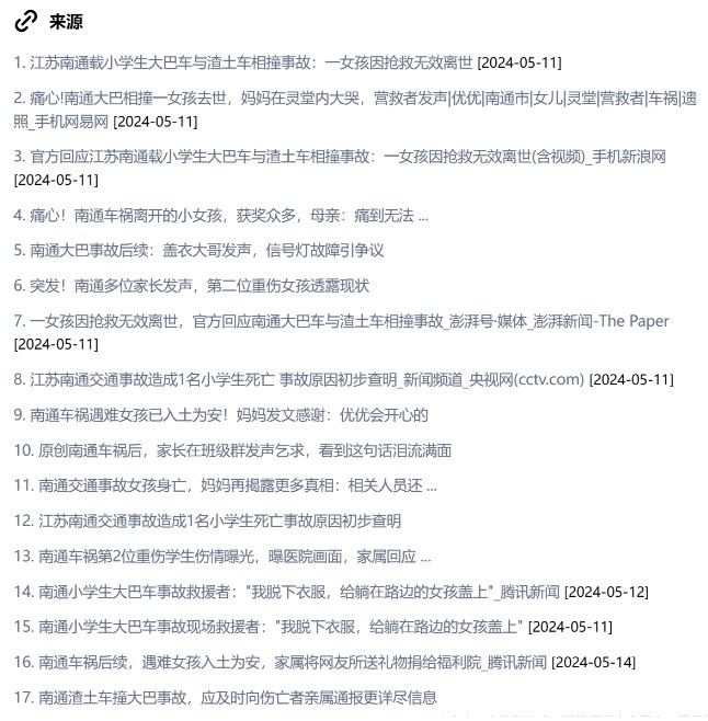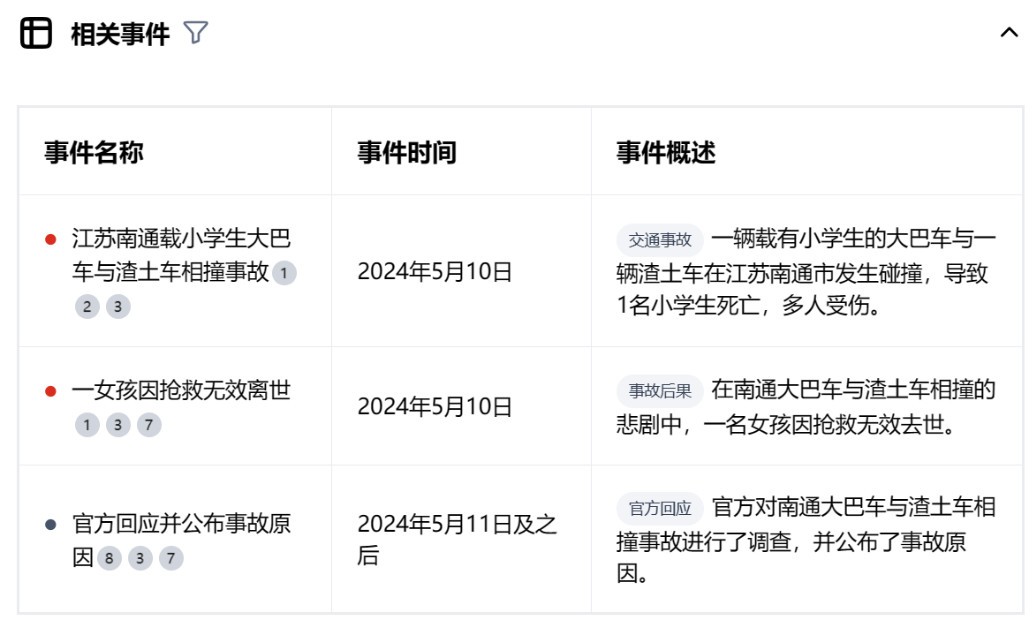 除了提供事件概述和脑图,秘塔AI搜索还会自动梳理相关事件,我们能从事件名称、事件时间及事件概述这三方面,知悉事情的发展过程。