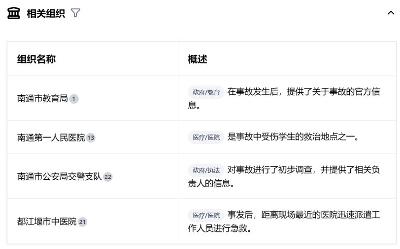 自动整理相关事件、组织和人物: