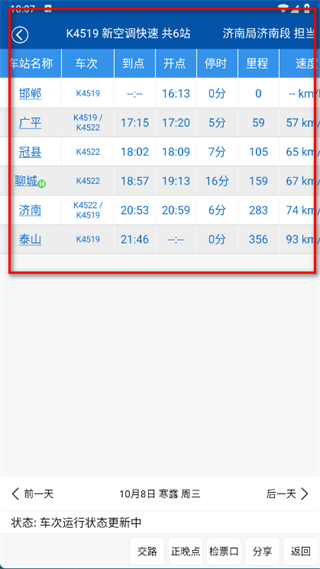 4、查看该车次的站点、到点、开点等详细时刻表信息。