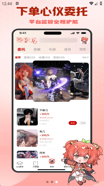 委托服务:提供cos委托、妆娘造型、摄影摄像、周边道具定制等线上交易服务,用户可查看服务方价格、擅长领域及IP属地。