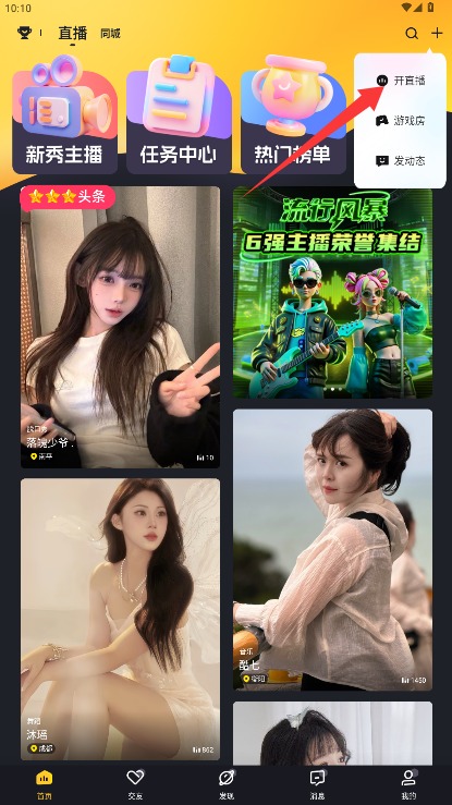 3、在直播界面点击右上角的+号按钮,从弹出菜单中选择开直播功能入口。
