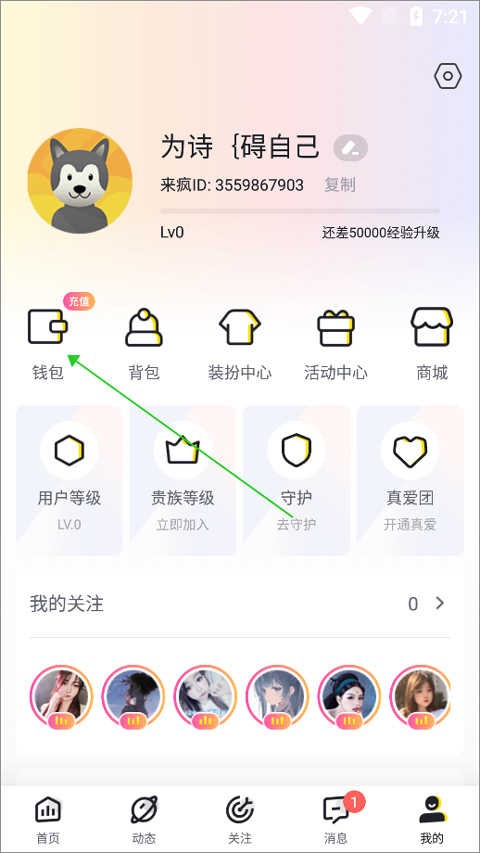 1、打开并登录来疯直播,进入我的页面中点击【钱包】
