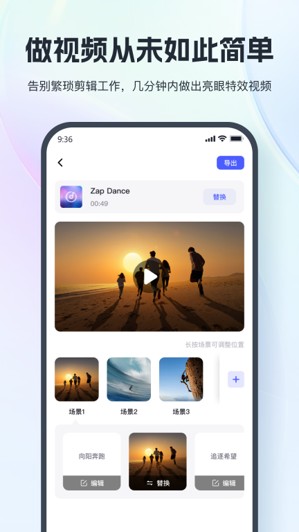 2、视频制作更轻松:无需再面对复杂的剪辑步骤,短短几分钟就能做出带酷炫特效的视频,操作简单又能提高效率。
