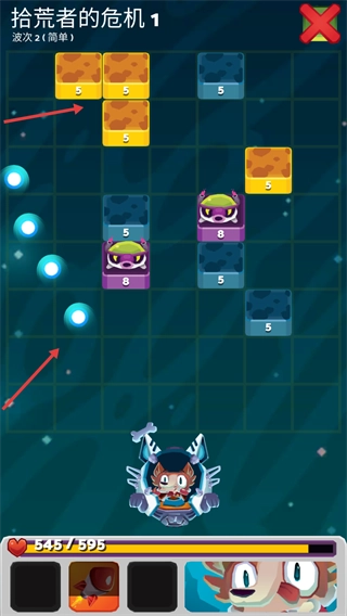 3、处于该波次关卡时,优先处理【黄色砖块】-5和【蓝色砖块】-5,同时避开【紫色敌人】-8的攻击,保持自身血量状态。
