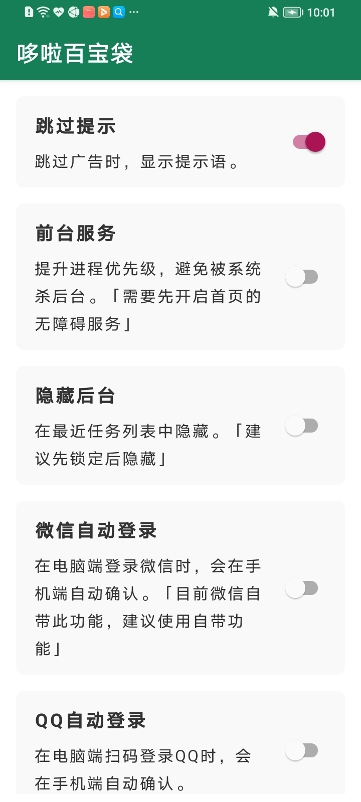 设置选项:可调整跳过提示音、后台隐藏模式、振动反馈等细节。